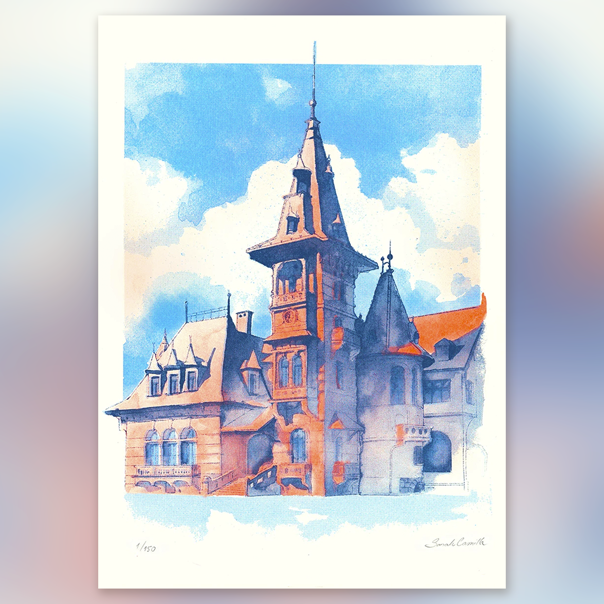 Risografika kaštieľa v Prievoze je výnimočná najmä jeho akvarelovým spracovaním a dominantou tejto grafiky je členitá a známa kláštorná zvonica. Je to vôbec prvýkrát, kedy sme pri tvorbe použili techniku akvarelu.