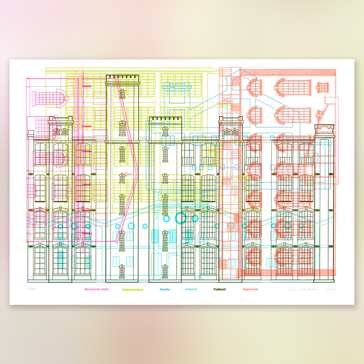 Na grafiku sme použili dva papiere. Niektoré už zbúrané budovy sa nachádzajú na papieri Munken polar a budovy, ktoré stoja dodnes sú na polopriehľadnom papieri Glama basic.