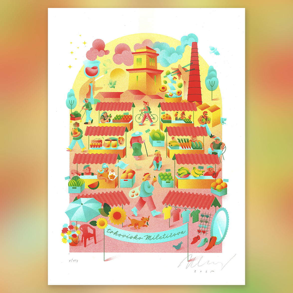 Slovenská grafička Karolína Uherčíková zachytila túto jedinečnú atmosféru vo svojej hravej risografike. Farebné stánky, typické slnečníky a plastové stoličky, čerstvé ovocie so zeleninou, oblečenie aj ikonický tehlový komín vytvárajú pestrú mozaiku každodenného života na Miletičke. Vďaka žiarivým farbám a jemnému zrnu risotlače dýcha grafika presne tým komunitným "vajbom", ktorý robí z Miletičky miesto, kam sa vždy radi vraciame.