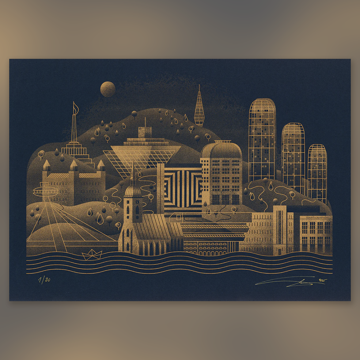 Risografika je limitovaná, vytlačená farbou metallic gold na modrý papier.