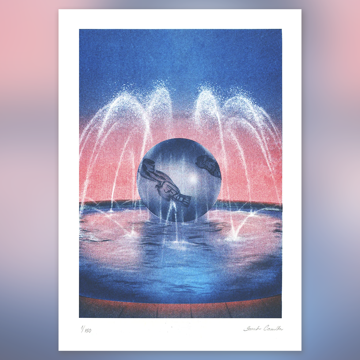 Grafika pracuje s prechodmi medzi farbami, ktoré symbolizujú pohľad na fontánu pri zapadajúcom slnku.