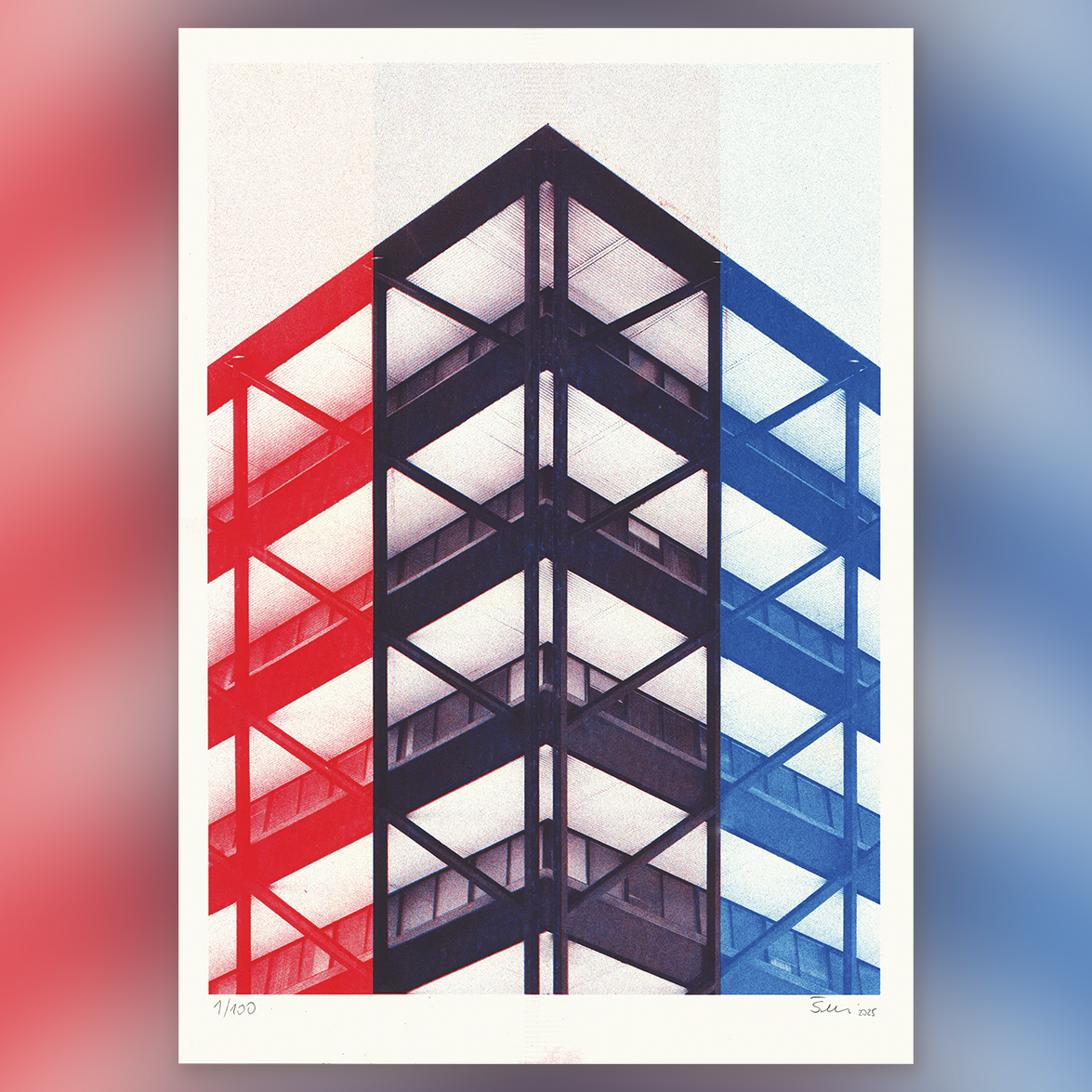 Fotografia spracovaná do risografiky zachytáva v detailoch množstvo okenných tabúľ budovy v mohutnej konštrukcii. Vďaka výraznej farebnej kombinácii použitej pri tlači, si grafika drží retro vzhľad, ktorý má aj samotná budová už niekoľko desaťročí, kedykoľvek sa okolo nej prejdeme.